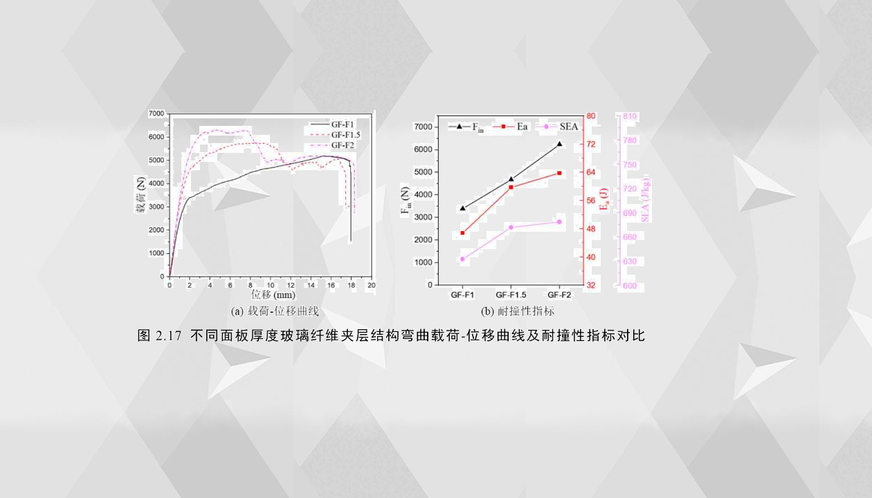 2.4.1面板對結(jié)構(gòu)耐撞性能影響——E圖2.17(a)比較了不同面板厚度玻璃纖維夾層結(jié)構(gòu)的載荷-位移曲線,可以看出,三者都屬于曲線類型Ⅲ,GF-F1與GF-F1.5的臨界失效模式為壓痕壓入(IN),其發(fā)生臨界失效之后載荷并沒有下降,只是增加幅度減少,這和CF-F1類似。GF-F1從加載開始到試件整體完全失去承載能力,未出現(xiàn)明顯的較為緩慢的載荷下降。與GF-F1不同的是,GF-F1.5在彎曲位移9mm左右時,還出現(xiàn)芯層剪切裂紋以及后續(xù)的界面失效,載荷下降較多。GF-F2的臨界失效模式出現(xiàn)芯層剪切(CS)和壓痕壓入(IN)兩者的組合,在出現(xiàn)失效后的小段位移內(nèi),載荷沒有明顯下降趨勢,而是基本保持相對恒定;當加載位移繼續(xù)增加,出現(xiàn)明顯的芯層裂紋以及后續(xù)的界面失效,載荷顯著降低,這與GF-F1.5的后屈曲失效機理相似。