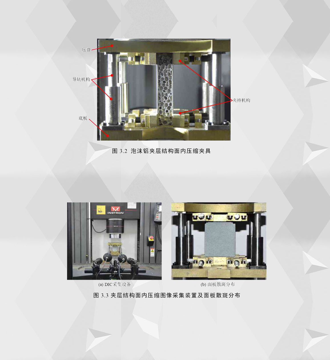 本章泡沫鋁夾層結構面內壓縮試驗所用到的實驗加載機器為INSTRON5894萬能試驗機,以恒定壓縮加載速率1mm/min作用在壓盤上。考慮到過大的加載位移可能超出夾層結構的承載能力,對其過大的變形研究意義不大,因此本章分析所有試件的極限加載位移的設定為5.5mm。為了獲得芯層泡沫鋁的破壞形式和面板的屈曲過程,對其側面(即圖3.2所示試件位置)進行圖像采集;與此同時,采用數字圖像相關技術(DIC)測量夾層結構面板的變形量,如圖3.3所示(a),根據DIC技術采集原理,在開始面內壓縮試驗之前需要對夾層結構面板表面噴涂啞光白漆作為底漆,等待底漆晾干之后再噴啞光黑漆,形成可以被DIC采集設備識別的散斑,面板處理之后散斑分布效果如圖3.3(b)所示。