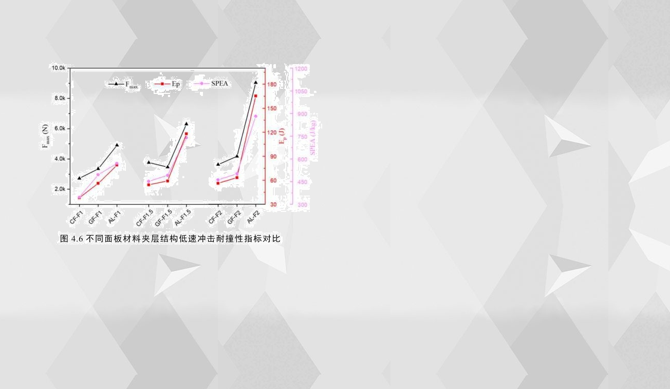 為了更為直觀地比較不同面板材料的夾層結(jié)構(gòu)的抗沖擊性能,4.6比較了相同面板厚度但面板材料不同的夾層結(jié)構(gòu)的耐撞性指標(biāo),通過比較可以看出,鋁合金夾層結(jié)構(gòu)有最優(yōu)的耐撞性能,其臨界穿透能高達(dá)118J初始峰值載荷高達(dá)6297N而碳纖維增強(qiáng)夾層結(jié)構(gòu)的耐沖擊性能明顯低于鋁合金夾層結(jié)構(gòu)的,其臨界穿透能和初始峰值載荷分別為54J和3752N而與碳纖維增強(qiáng)夾層結(jié)構(gòu)相比,玻璃纖維的耐碰撞性略有提高,其臨界穿透能為59J。此外,根據(jù)三者完全穿透試件的載荷-位移在第一階段的斜率可以看出,如圖4.5(d)鋁合金夾層結(jié)構(gòu)的斜率最大,也就是說,在低速沖擊工況下,鋁合金夾層結(jié)構(gòu)的剛度大于纖維增強(qiáng)夾層結(jié)構(gòu)的剛度。通過觀察面板厚度為1mm和2mm試件的耐撞性指標(biāo),也可以知道,在低速沖擊工況下,鋁合金夾層結(jié)構(gòu)有最好的耐撞性能,而碳纖維夾層結(jié)構(gòu)的耐撞性能在三者幾乎是最差的。