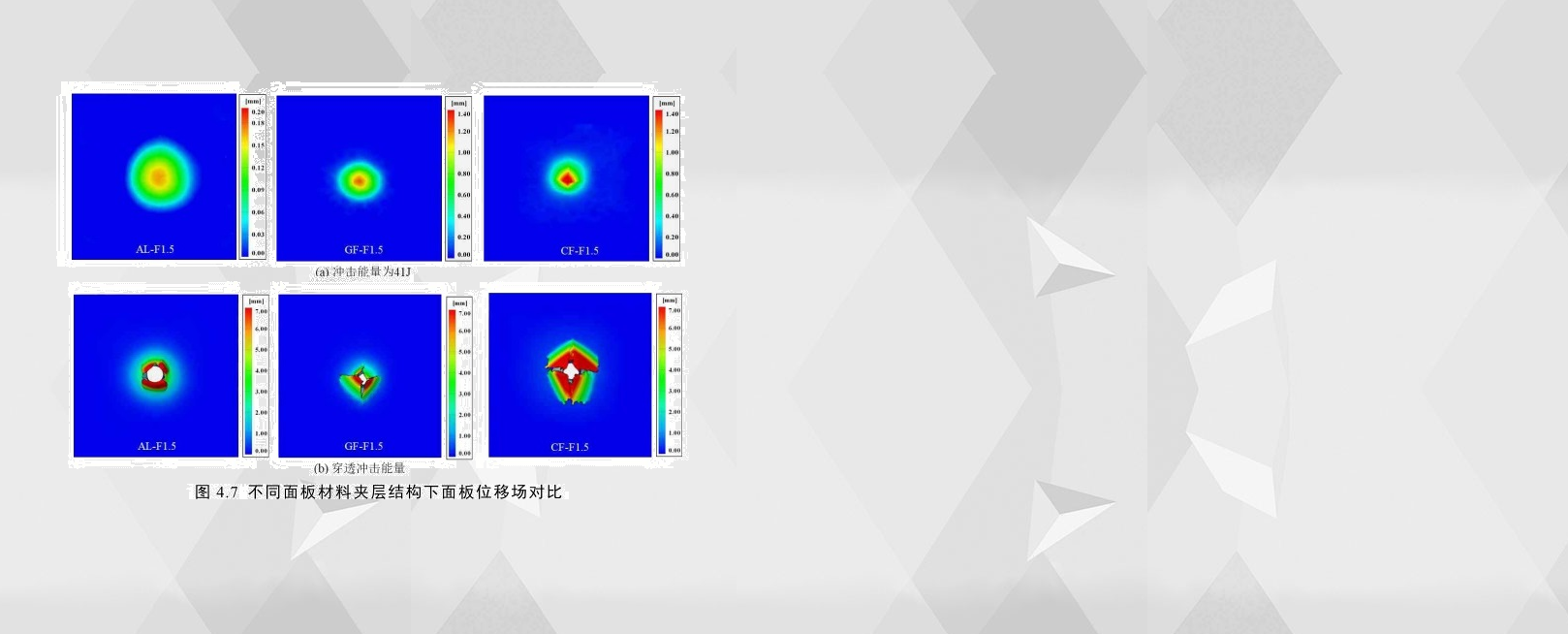 在低速沖擊實驗研究過程中,面板的變形量(尤其是下面板的變形量)對防護性能的評估極為重要,因此分析夾層結構下面板最大變形是十分必要的,圖4.7(a)為三種面板厚度為1.5mm的夾層結構在沖擊能量為41J下的下面板變形位移場;通過比較三者的變形可以看出,鋁合金夾層結構的下面板變形面積是最大的,而其沖頭垂直方向的最大變形量是最小的;此外CF-F1.5與GF-F1.5比較而言,兩者的變形面積相差不大,但前者的最大變形量更大,并且可以看到明顯的十字形裂紋。圖4.7(b)為同配置條件下的試件在穿透沖擊能量下的下面板變形位移場;可以看出,AL-F1.5的下面板變形位移場的形狀為圓形,相比之下,CF-F1.5的下面板可以看到呈菱形的穿孔且位移變形的區域比前者要大一些,此外,GF-F1.5的位移場的大小和破壞形式介于其余兩者之間。從以上的分析中也可以得出,在同等尺寸配置,鋁合金夾層結構耐沖擊性能更好,而碳纖維夾層結構的耐沖擊性能可能是最差的。