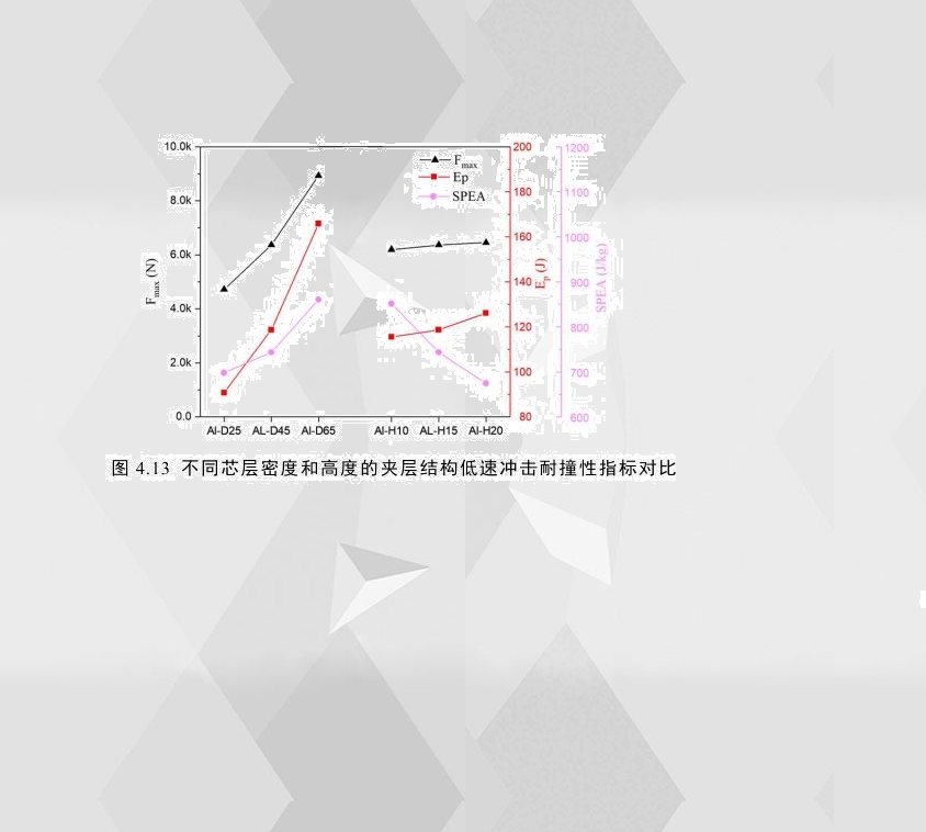 根據(jù)各配置的試件在穿透能沖擊下的載荷-位移曲線,計(jì)算得出各耐撞性指標(biāo)比較如圖4.13所示,可以看出,隨著夾層結(jié)構(gòu)芯層密度的上升,其耐撞性能明顯提高,芯層密度從0.25g/cm3增加到0.65g/cm3,夾層結(jié)構(gòu)的初始峰值載荷增加89%,穿透吸能提高82%,比穿透能提高23%;對芯層高度而言,試件的芯層高度從10mm增加到20mm,其初始峰值載荷和穿透吸能均只有小幅增加,特別是初始峰值載荷,增加的幅度基本忽略不計(jì),而其比穿透能反而明顯降低,大約下降了25%。