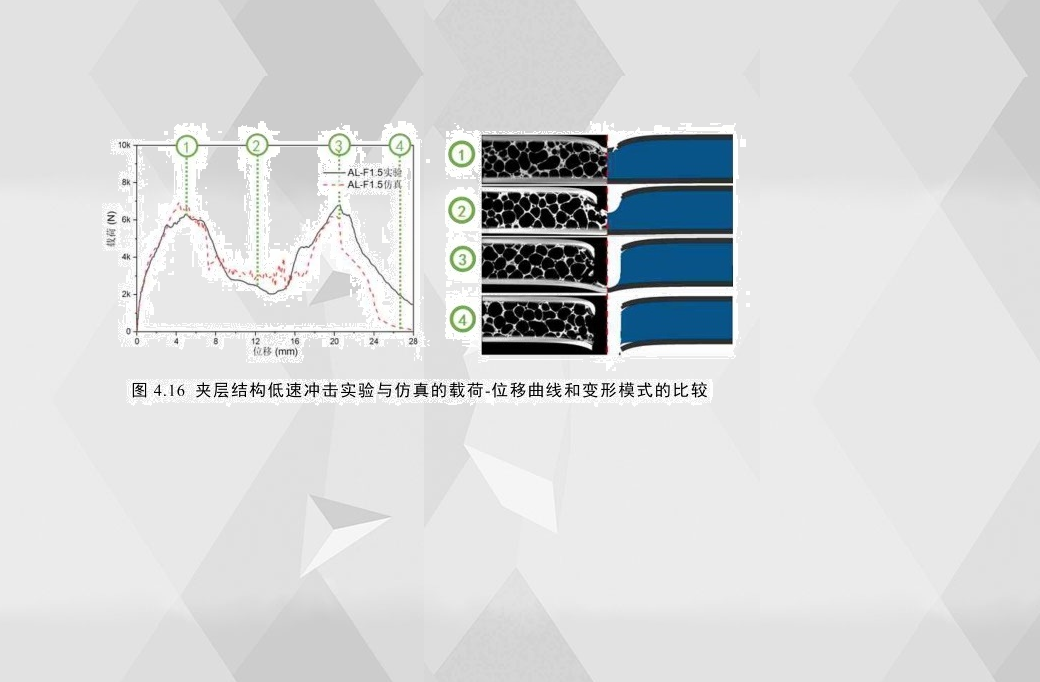 4.16比較了AL-F1.5試驗和仿真在完全穿透沖擊能量下的載荷-位移曲線以及不同沖擊能量下的變形過程。可以看出,無論是抗沖擊響應還是結(jié)構(gòu)變形模式,試驗和仿真都吻合得較好。由于仿真加載過程中網(wǎng)格單元的失效以及刪除使得其載荷-位移曲線存在一些波動,而其初始峰值載荷和穿透吸能的誤差范圍保持在5%和10%以內(nèi)。